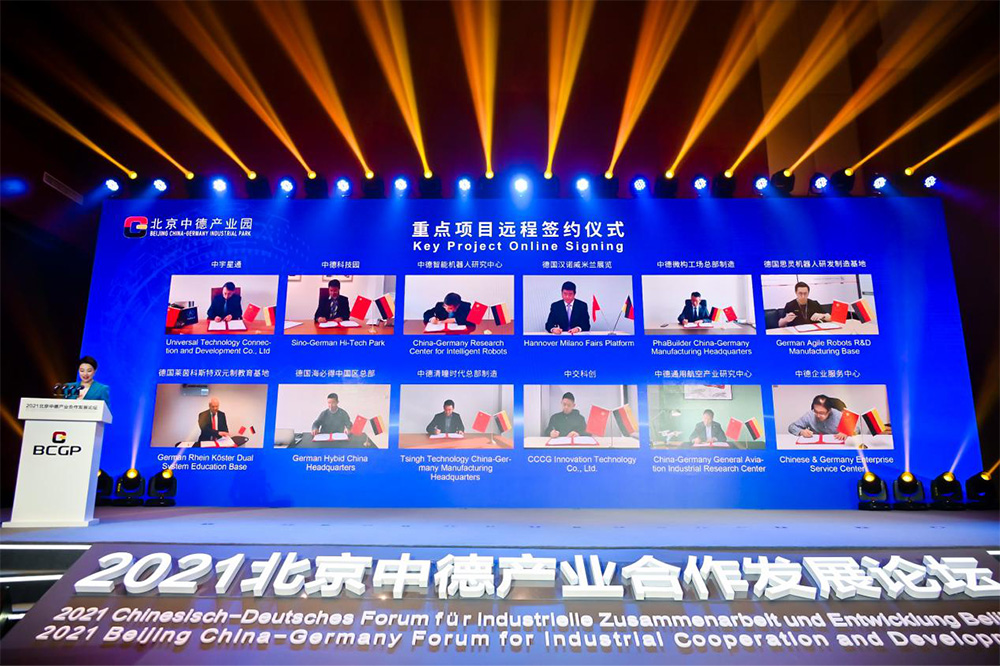 2021年12月23日,中德产业合作发展论坛在国测国际会议会展中心开幕,以“线上+线下”方式,在德国柏林、慕尼黑和法兰克福设立分会场,并通过多平台进行全球直播。论坛上,北京中德产业园正式宣布开园,北京中德产业园管委会与国家发改委国际合作中心、中国德国商会签署全面战略合作协议,将携手拓展与德国及欧洲的经济技术领域务实合作。随后,德国威乐集团全球第二总部、博世工业4.0创新中心、惠乐喜乐机床应用研发中心、莱茵科斯特中国区总部等22个重点项目成功签约。